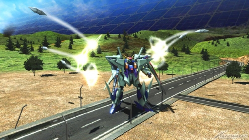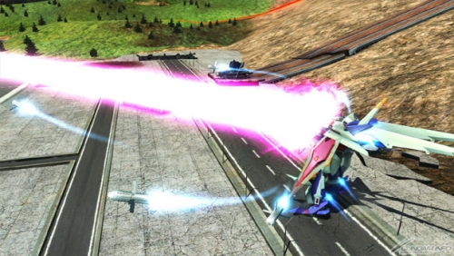 ▲ Its main weapon, the high-powered beam rifle, can also be combined with a volley from the leg-mounted missile launchers.