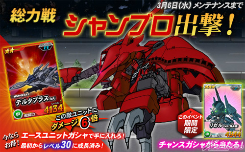また、「シャンブロ」に対し6倍の攻撃力を発揮する「デルタプラス(MA)」がエースユニットガシャに追加されるほか、チャンスガシャには「リゼル(MS/隊長機)」が登場。ぜひともこの機会にガシャを回して手に入れよう。