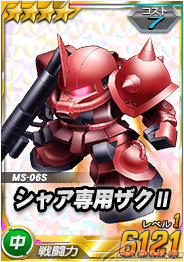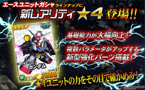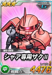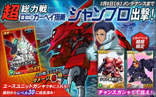 同機を倒した時に引くことができる「チャンスガシャS」には、新レアリティ「★4」の「シャア専用ザクII」を獲得できるチャンスがあるほか、エースユニットガシャには「ロニ・ガーベイ搭乗シャンブロ」に対し6倍の攻撃力を発揮する「ユニコーンガンダム」が追加される。