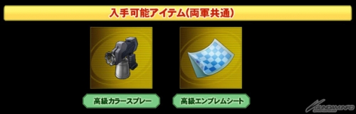 ▲襲撃戦イベントでは「設計図」、「カラースプレー」、「エンブレムシート」が入手できる。