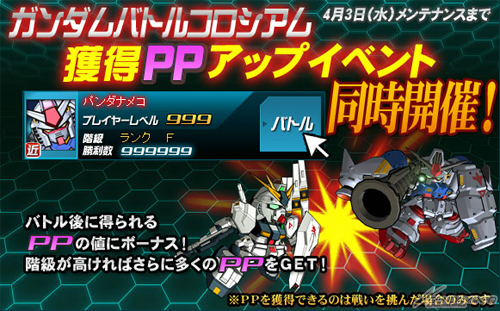 本日3月27日(水)から4月3日(水)までの期間限定で、「ガンダムバトルコロシアム」、および「獲得PPアップキャンペーン」が開催される。