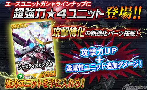 さらに本日よりエースユニットガシャに「★4 ジャスティスガンダム」が新たに追加された。
