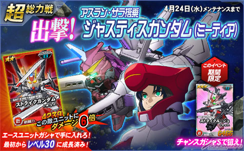 From noon April 17th through April 24th, players can encounter Athrun's Justice Gundam (METEOR) in a super group battle. Take on missions this week for a chance to encounter it..