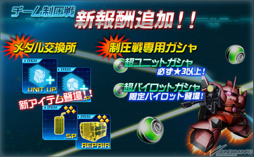 「制圧戦ガシャ」では、ここでしか入手できないレアなユニットやパイロットが手に入ることがあり、また、「メダル交換所」では集めた「メダル」を様々な特殊アイテムなどと交換することが可能。豪華報酬を目指してチーム制圧戦で上位を狙おう。