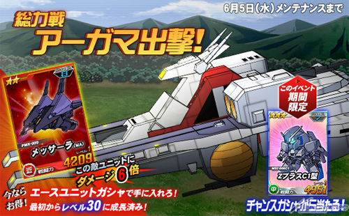 「アーガマ」を倒した際に引くことができるチャンスガシャには、「ΖプラスC1型」を獲得できるチャンスがあるほか、エースユニットガシャには「アーガマ」に対し6倍の攻撃力を発揮する「メッサーラ(MA)」が追加される。