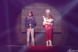 開会式では、アムロとシャア、それぞれのものまねでおなじみの芸人、若井おさむ氏とぬまっち氏が、さらに司会進行役として、椿姫彩菜さんがルナマリア・ ホークの衣装をまとって登場。さらに、本作の制作プロデューサーである大久保人氏、総合プロデューサー・馬場龍一郎氏が登壇し、今大会への期待を語る。