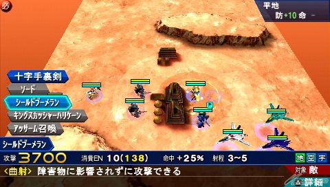 MAP上で敵との間に障害物がある場合、通常は敵に攻撃できないが、「曲射攻撃」が可能な武器を持つユニットの場合、障害物を挟んで攻撃することができる。