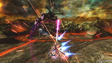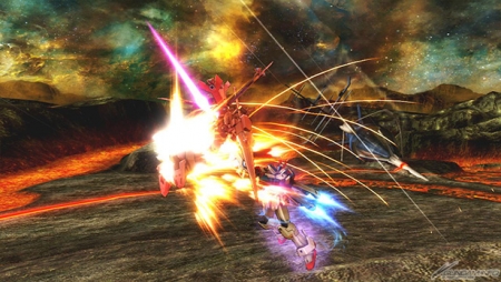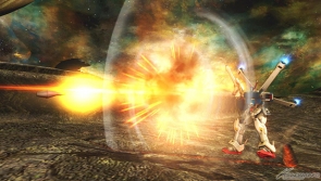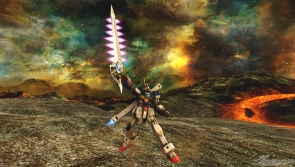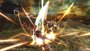 ▲チャージ格闘では「ムラマサ・ブラスター」のセーフティを解除して、複数のビームサーベルを発生させる。セーフティ解除により格闘性能がアップするほか、解除中専用の格闘が追加されるなど様々な効果が得られるが、時間経過で終了する。