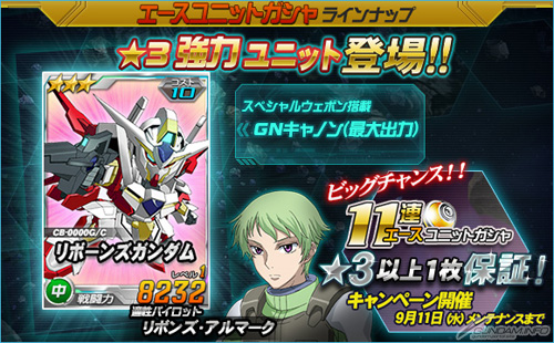 エースユニットガシャには、同じく本日より「★3 リボーンズガンダム」や「★3 マスラオ」および「★3 ガデッサ」などの強力なユニットが追加された。「★3 リボーンズガンダム」は、スペシャルウェポン「GNキャノン(最大出力)」を搭載している超強力な機体だ。