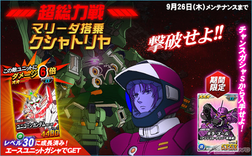 「マリーダ搭乗クシャトリヤ」を倒した際に引くことができるチャンスガシャSには、「ギラ・ズール(アンジェロ・ザウパー専用機)」を獲得できるチャンスがあるほか、エースユニットガシャには「マリーダ搭乗クシャトリヤ」に対し6倍の攻撃力を発揮する「ユニコーンガンダム(NT-D)」が追加される。