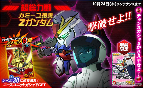 「カミーユ搭乗Ζガンダム」を倒した際に引くことができるチャンスガシャSには、「ガンダムMk-II」を獲得できるチャンスがあるほか、エースユニットガシャには「カミーユ搭乗Ζガンダム」に対し6倍の攻撃力を発揮する「ジ・O」が追加される。