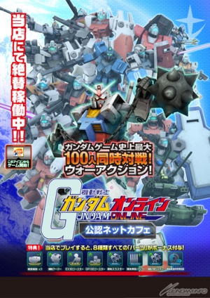 本サービスは、公認ネットカフェから「機動戦士ガンダムオンライン」をプレイすると、追加料金なしで8種のパーツを常に付けた状態でプレイできるというもの。