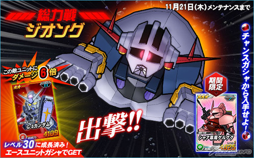 「ジオング」を倒した際に引くことができるチャンスガシャには、「シャア専用ゲルググ」を獲得できるチャンスがあるほか、エースユニットガシャには「ジオング」に対し6倍の攻撃力を発揮する「G-3ガンダム」が追加される。