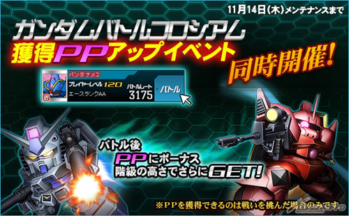 同じく本日11月7日(木)から11月14日(木)までの期間限定で、「ガンダムバトルコロシアム」、および「獲得PPアップキャンペーン」がスタートした。