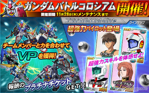 同じく本日から11月28日(木)までの期間限定で「ガンダムバトルコロシアム」、および「獲得PPアップキャンペーン」がスタートした。
