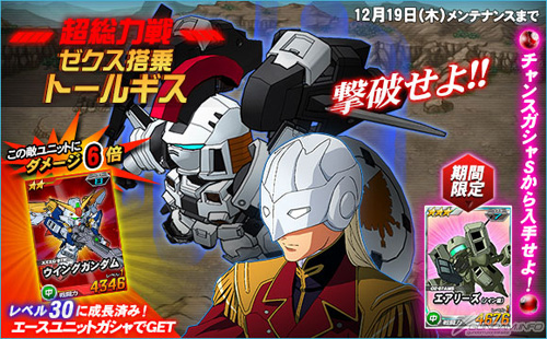 「ゼクス搭乗トールギス」を倒した際に引くことができるチャンスガシャSには、「エアリーズ(ノイン機)」を獲得できるチャンスがあるほか、エースユニットガシャには「ゼクス搭乗トールギス」に対し6倍の攻撃力を発揮する「ウイングガンダム」が追加される。
