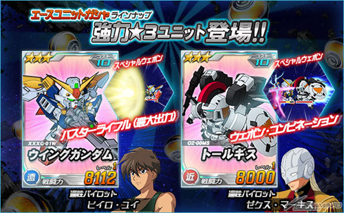 エースユニットガシャには、同じく本日より「★3 ウイングガンダム」、「★3 トールギス」、「★3 シェンロンガンダム」が追加された。「★3 ウイングガンダム」および「★3 トールギス」は、スペシャルウェポンを搭載した超強力な機体となっているので、ぜひとも手に入れよう。