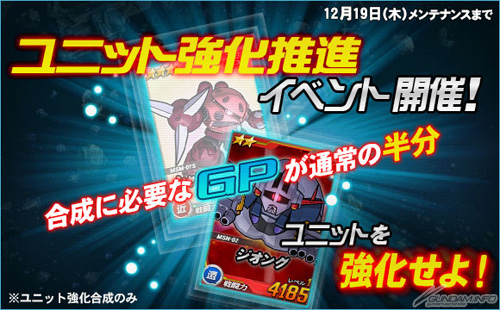さらに、ユニット合成時に必要となる「GP」の量が減少する「ユニット強化費用軽減イベント」もスタート。期間中は効率よくユニット合成を行なうことができるのでお見逃しなく。開催期間は12月19日(木)まで。