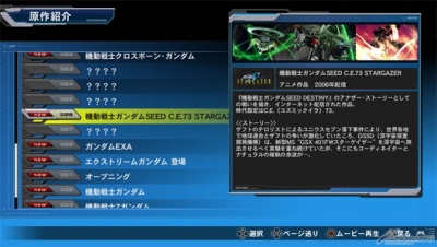 「ギャラリー」モードでは、機体を使用したりバトルを進めることで、「機体紹介」、「キャラクター紹介」、「原作紹介」の各項目に情報が追加されていく。
