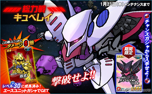 総力戦には本日から1月23日(木)までの期間限定で「キュベレイ」が登場し、期間中に任務を実行すると、まれにエンカウントすることがある。