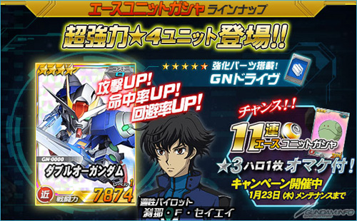 さらに、エースユニットガシャに「★4 ダブルオーガンダム」が追加されたほか、「11連ガシャ★3ハロおまけキャンペーン」と「ログインボーナスキャンペーン」も本日よりスタートした。