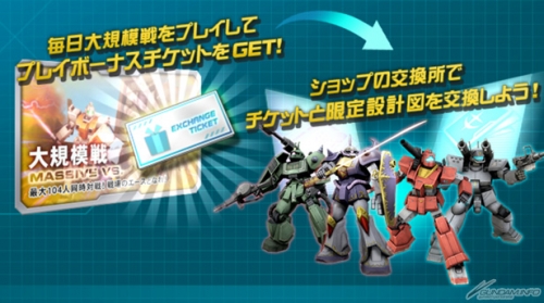 大規模戦を1回プレイすると獲得できる「プレイボーナスチケット」は、一定数集めることでショップ内に新設された「交換所」にて限定機体の設計図やアイテムと交換することができる。