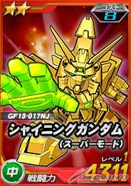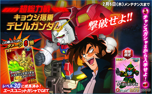 「キョウジ搭乗デビルガンダム」を倒した際に引くことができるチャンスガシャSには、「★3 クーロンガンダム」を獲得できるチャンスがあるほか、エースユニットガシャには「キョウジ搭乗デビルガンダム」に対し6倍の攻撃力を発揮する「★2 シャイニングガンダム(スーパーモード)」が追加される。