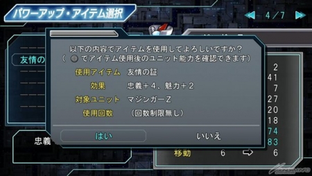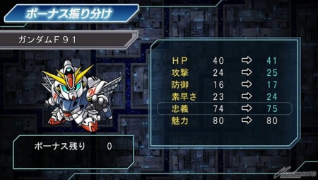 Units' HP, SP, Attack, Defense, and Agility improve on level up. Their Loyalty, Charisma, and Speed can also be increased by using items between missions. There are also items that grant experience directly.