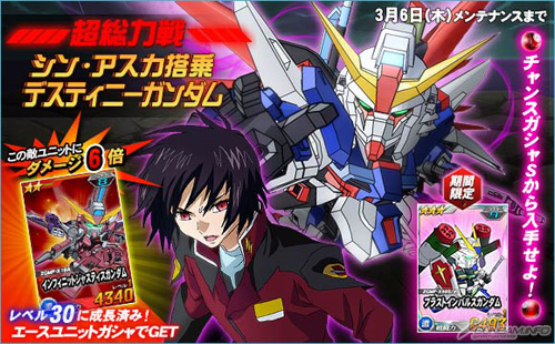「シン・アスカ搭乗デスティニーガンダム」を倒した際に引くことができるチャンスガシャSには、「★3 ブラストインパルスガンダム」を獲得できるチャンスがあるほか、エースユニットガシャには「シン・アスカ搭乗デスティニーガンダム」に対し6倍の攻撃力を発揮する「★2 インフィニットジャスティスガンダム」が追加される。