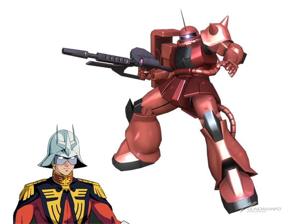 「機動戦士ガンダム」よりシャア専用ザクIIが参戦!中隊指揮官用ザクを赤とピンクのパーソナルカラーに塗り分けたシャアの専用機。中隊長機の印として頭にブレードアンテナを有し、ザクの3倍のスピードで敵に迫ったことから「赤い彗星」として連邦将兵に恐れられた。