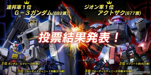 投票総数4,000票を超える中から選ばれたのは、地球連邦軍が「G-3ガンダム」、そしてジオン公国軍が「アクトザク」となった。この2機の「LV5」は、これまで課金による「ウォレット」でしか開発することができなかったが、今回よりゲーム内で無料で入手できる「開発ポイント」でも開発できるようになった。