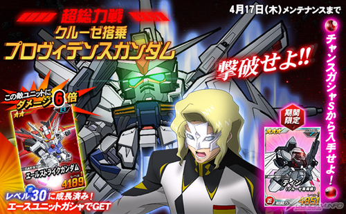 超総力戦には本日から4月17日(木)までの期間限定で「クルーゼ搭乗プロヴィデンスガンダム」が登場し、期間中に任務を実行すると、まれにエンカウントすることがある。