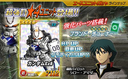 エースユニットガシャには、同じく本日より「★4 ガンダムEz8」、「★3 ガンダムヘビーアームズ」の2機が追加された。「★4 ガンダムEz8」は、強化パーツ「ブランド・チューナー」を搭載する強力なユニットとなっているので、ぜひともゲットしよう。