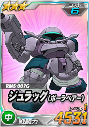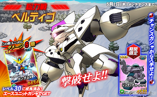 同機を倒した際に引くことができるチャンスガシャには、「★3 ジュラッグ(ポーラベアー)」を獲得できるチャンスがあるほか、エースユニットガシャには「ベルティゴ」に対し6倍の攻撃力を発揮する「★2 ガンダムX」が追加される。