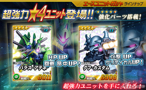 エースユニットガシャに新たに追加された「★4 パラス・アテネ」、「★4 グフ・カスタム」の2機は、強化パーツを搭載した強力な機体となっている。