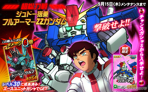 本日より5月15日(木)までの期間限定で、「ジュドー搭乗フルアーマーΖΖガンダム」が登場する「超総力戦」と、「ΖΖガンダム」が登場する「総力戦」が同時に開催され、それぞれ期間中に任務を実行するとまれにエンカウントすることがある。