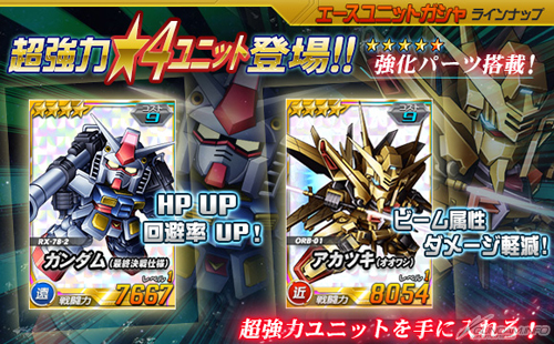 同じく本日よりエースユニットガシャには、強化パーツを搭載する強力なユニット「★4 ガンダム(最終決戦仕様)」と「★4 アカツキ(オオワシ)」が新たに追加された。