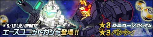 そしてエースユニットガシャに、「★3 ユニコーンガンダム」、「★3 バンシィ」が登場。さらにプラチナパイロットガシャには、「★3 バナージ・リンクス」、「★3 マリーダ・クルス」が追加されたのでぜひともチェックしてみよう。