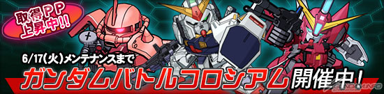同じく本日6月10日(火)から6月17日(火)までの期間限定で、「ガンダムバトルコロシアム」、および「獲得PPアップキャンペーン」がスタートした。
