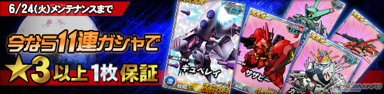 同じく本日から6月24日(火)までの期間限定で「11連ガシャ★3ユニット1枚保証キャンペーン」がスタート。キャンペーン期間中は11連エースユニットガシャを引くと、必ず★3以上のユニットを1機入手することができる。今回★3以上保証枠で獲得したユニットは全て初期Lvが「Lv.20」に成長済となっているので、ぜひともチャレンジして強力ユニットを手に入れよう。