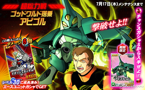 同機を倒した際に引くことができるチャンスガシャSには、「★3 アビゴル(MS)」などを獲得できるチャンスがあるほか、エースユニットガシャには「ゴッドワルド搭乗アビゴル」に対し6倍の攻撃力を発揮する「★2 Vダッシュガンダム」が追加される。