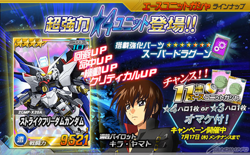 さらに、エースユニットガシャには「★4 ストライクフリーダムガンダム」が追加されたほか、「11連ガシャ★3 or ★4ハロおまけキャンペーン」や「チーム制圧戦」など、4つのキャンペーンとイベントも開始された。