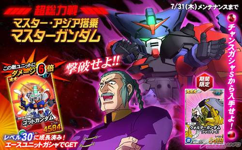 超総力戦には7月31日(木)までの期間限定で「マスター・アジア搭乗マスターガンダム」が登場し、期間中に任務を実行すると、まれに遭遇することがある。