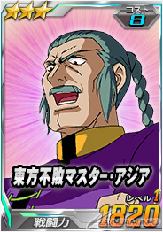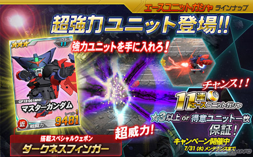 本日よりエースユニットガシャには、スペシャルウェポン「ダークネスフィンガー」を搭載した強力な機体「★3 マスターガンダム」が追加され、さらにプラチナパイロットガシャには「★3 東方不敗マスター・アジア」が追加された。