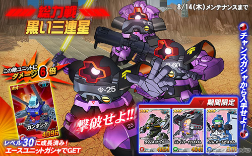 総力戦には8月14日(木)までの期間限定で「黒い三連星」が登場し、期間中に任務を実行すると、まれに遭遇することがある。