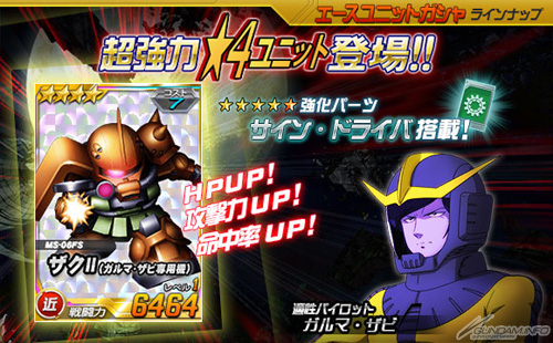 本日よりエースユニットガシャに、「★4 ザクII(ガルマ・ザビ専用機)」、「★3 リック・ドム(アナベル・ガトー専用)」が登場。「★4 ザクII(ガルマ・ザビ専用機)」は、強化パーツ「サイン・ドライバ」を搭載する強力な機体となっているので、ぜひとも手に入れよう。