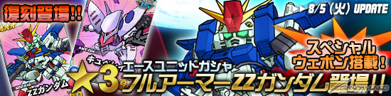 エースユニットガシャに「★3 フルアーマーΖΖガンダム」、「★3 ΖΖガンダム」、「★3 キュベレイ」が登場する。「★3 フルアーマーΖΖガンダム」はスペシャルウエポン「ハイ・メガ・キャノン」を搭載した強力なユニットとなっているので、ぜひチェックしてみよう。