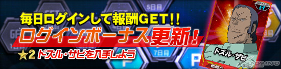 期間中ゲームにログインすると1日1回報酬がもらえるログインボーナスの、報酬内容が更新された。今回のログインボーナスでは、20日目の報酬に「★2 ドズル・ザビ」が登場するので、ぜひチェックしてみよう。実施期間は9月2日(火)メンテナンス開始まで。