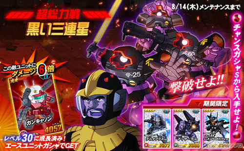 また、エースユニットガシャには、「黒い三連星」に対し6倍の攻撃力を発揮する「★2 ガンキャノン」が追加される。