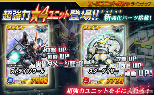 さらに本日よりエースユニットガシャに、「★4 スターゲイザー」、「★4 ストライクノワール」が登場するほか、プラチナパイロットガシャには「★3 スウェン・カル・バヤン」が登場。こちらもあわせてチェックしよう。